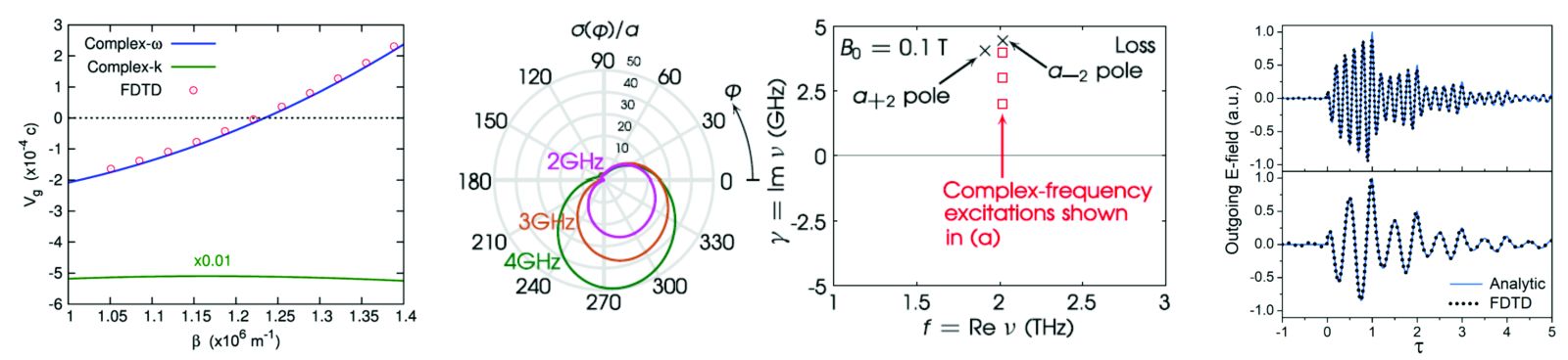 We were the first group (back in 2014) to show how these solutions can be excited in the time domain (i.e., in realistic experimental setups) [1], and more recently we proposed the first fully-analytic closed-form description of these excitations in the context of attaining ‘virtual absorption’ [2]. We have also recently introduced the concepts of anisotropic virtual gain and oblique Kerker effect [3], where a lossy anisotropic medium behaves exactly as its anisotropic gain counterpart upon excitation by a synthetic complex-frequency wave. That strategy allowed one to largely tune the magnitude and angle of a particle’s scattering simply by changing the shape (envelope) of the incoming radiation, rather than by an involved medium- tuning mechanism. The so-attained anisotropic virtual gain enabled directional super-scattering at an oblique direction with fine-management of the scattering angle. We are currently exploring further consequences of and phenomena arising from these fascinating excitations. Our monograph on ‘Metamaterials and Nanophotonics’ [4] is the first book to detail these complex excitations.